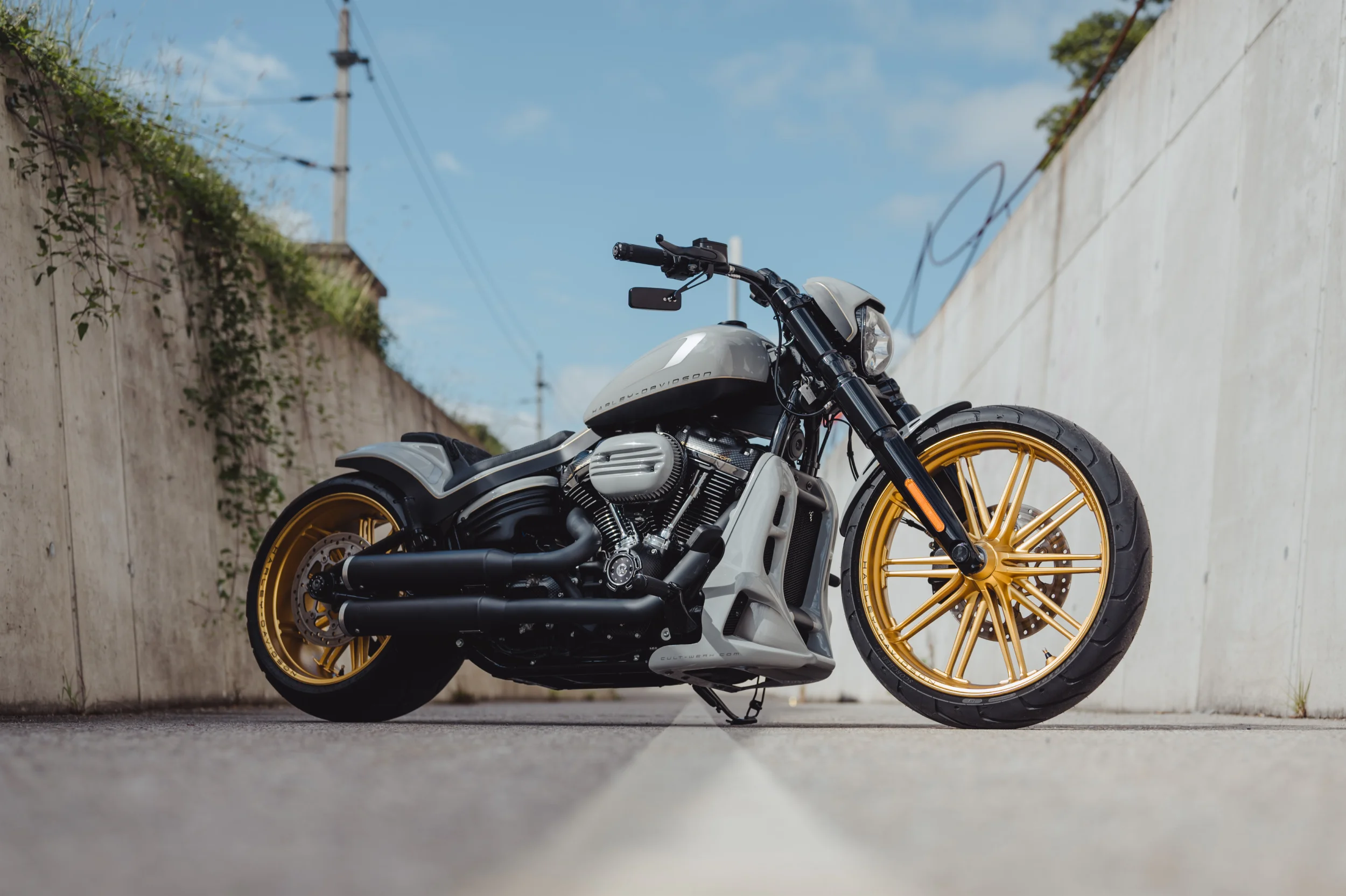 Dieses Bike wurde von CULT-WERK komplett umgebaut. Die Breakout bekam nur die hochwertigsten Teile und eine spezielle "Airbrush" Lackierung in der modernen Farbe "Nardo Grey". Zur Optik dazu wurden auch die Felgen dementsprechend umlackiert/gepulvert um das Gesamtpaket stimmig zu machen. Die Rocker-Boxen und seitlichen Motorabdeckungen wurden mit Carbon überzogen und bekamen auch noch goldene Schriftzüge. Und natürlich musste am Sound auch etwas geändert werden. Die Breakout bekam eine 2in2 Kesstech Komplettanlage mit elektronisch verstellbarer Klappe welche dem Bike einen brutalen Sound verleiht.