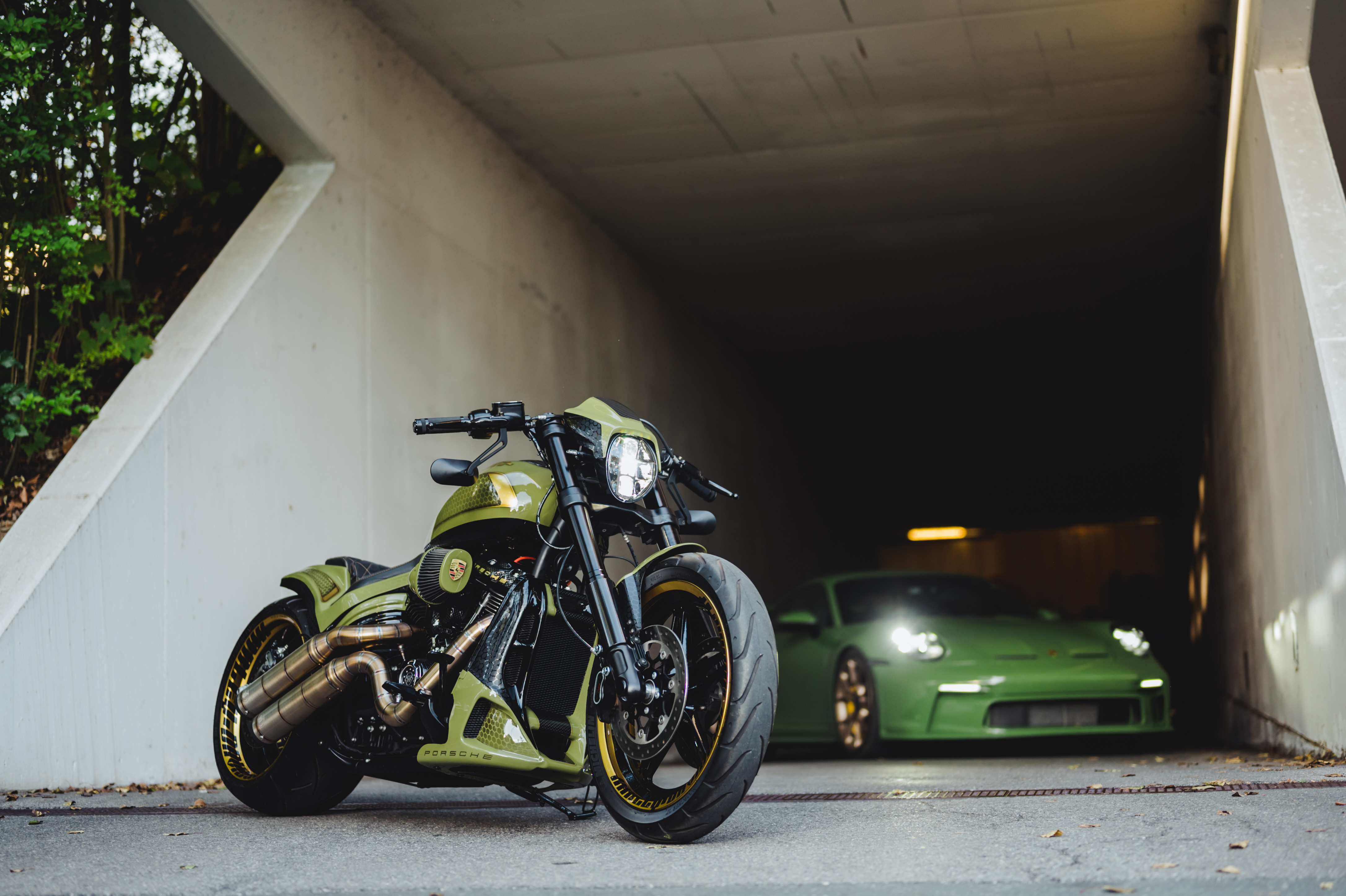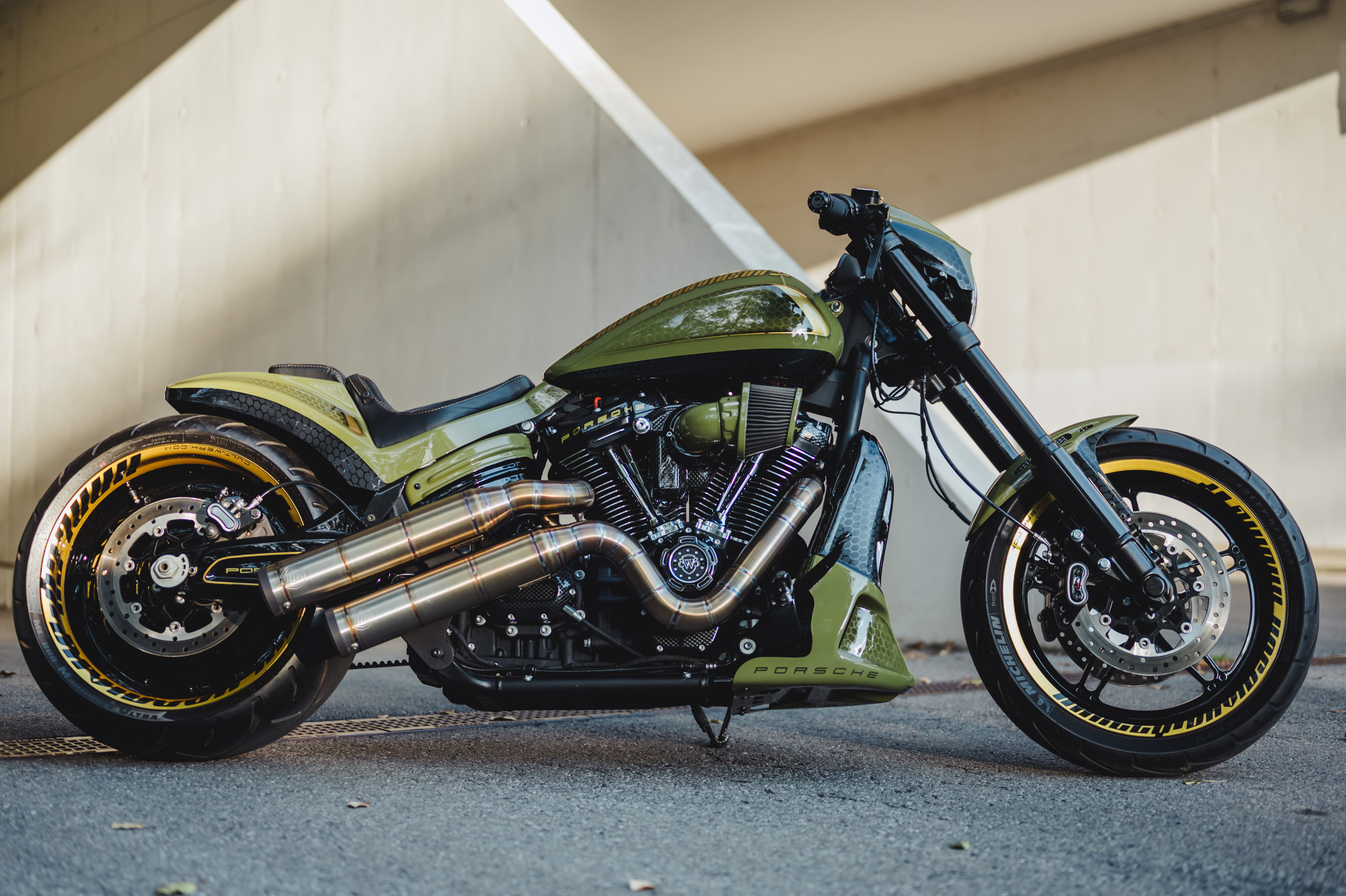 Die umgebaute Harley-Davidson© FXDR von Cult-Werk ist ein absolutes Meisterwerk. Im Porsche Look und in einem atemberaubenden olivgrünen Lack erstrahlt sie mit goldenen Akzenten. Jeder Blick auf dieses Bike lässt das Herz höherschlagen. Mit dem Kesstech Komplettauspuff, ausgestattet mit einer elektronischen Klappe, erzeugt sie einen unvergleichlichen Sound, der die Straßen erbeben lässt.