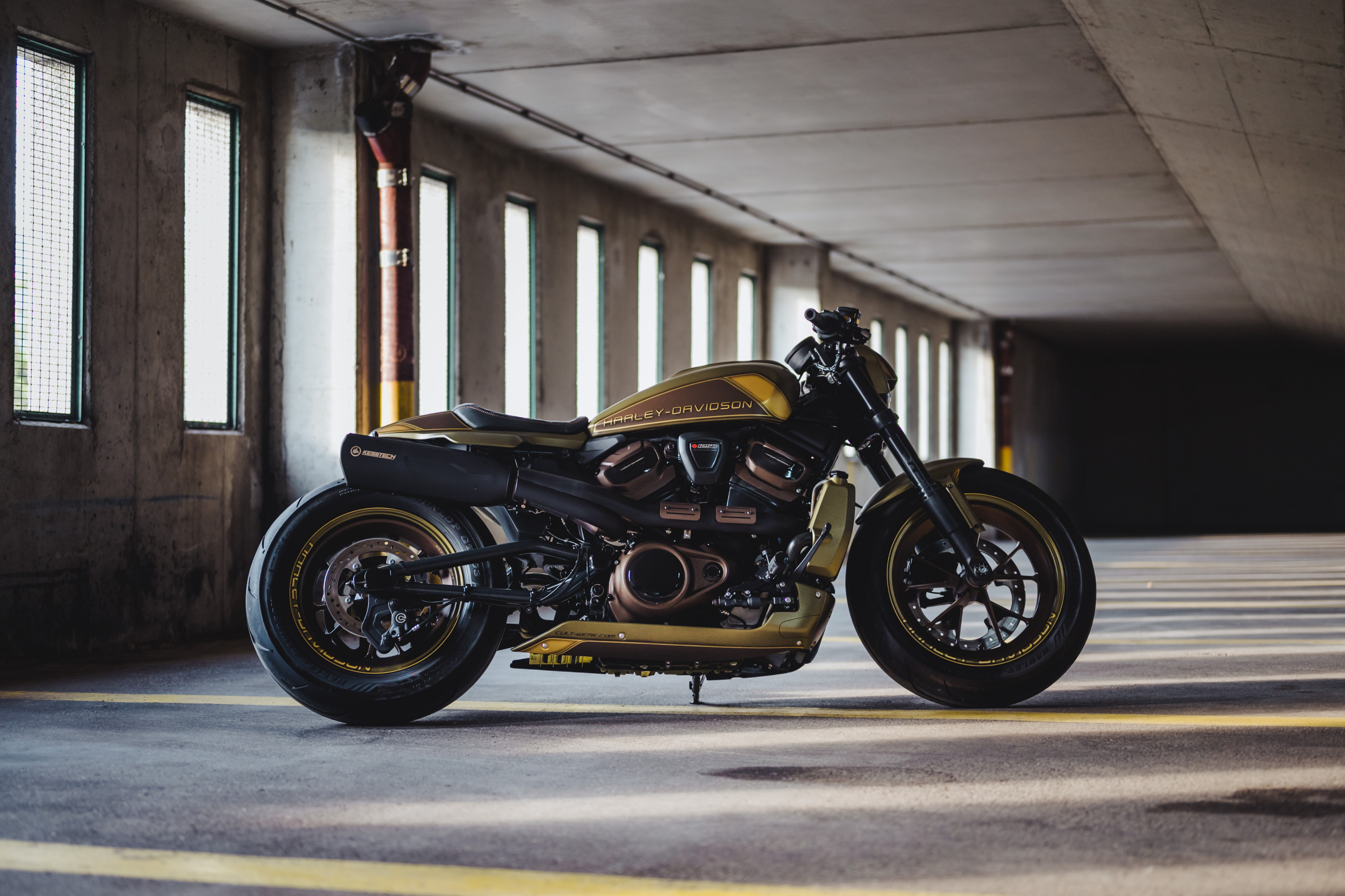 Die umgebaute Harley-Davidson© Sportster S im Sian Look, von Cult-Werk modifiziert und mit einem Kesstech Komplettauspuff ausgestattet, verkörpert Stil, Individualität und Leistung. Es ist ein Bike, das die Straßen in Gold-, Gelb- und Bronzetönen erstrahlen lässt. Ein absolutes Highlight für jeden Motorradliebhaber, der nach einem einzigartigen und aufregenden Fahrerlebnis sucht.