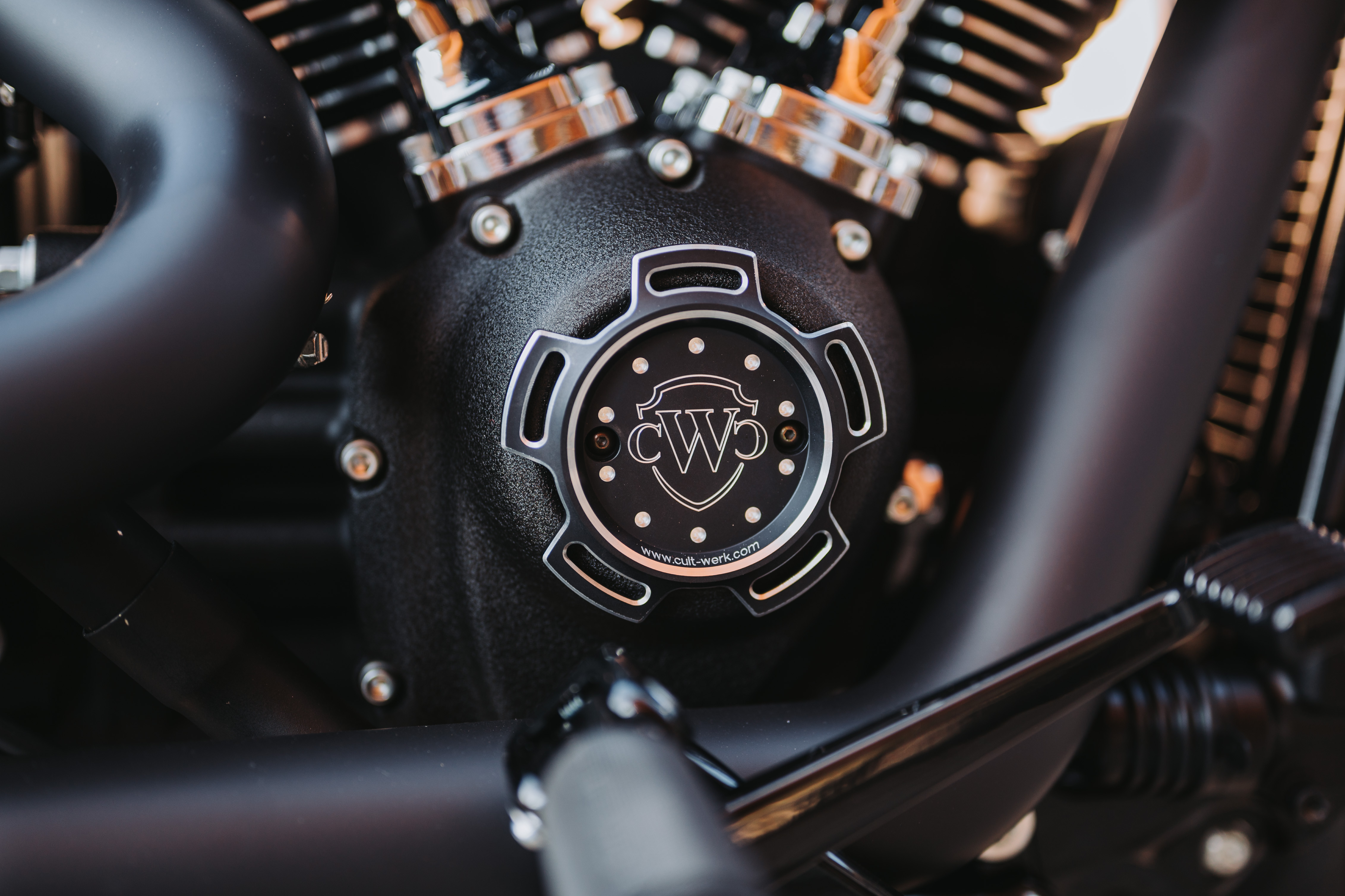 Die umgebaute Harley-Davidson© Street Bob, schwarz lackiert mit kleinen roten Details, ist ein wahrer Hingucker. Der Old-School Look verleiht diesem Bike eine zeitlose Eleganz, die alle Blicke auf sich zieht. Mit dem Umbau von Cult-Werk und den maßgefertigten Custom Parts wird diese Street Bob zu einem einzigartigen Unikat.